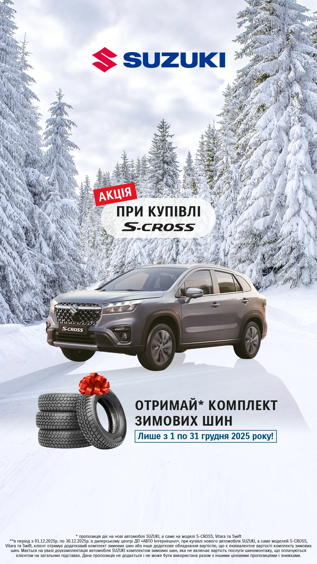 Офіційний дилерський центр «SUZUKI на Подолі» оголошує старт спеціальної зимової пропозиції: у період з 01.12.2025р по 07.01.2026р. кожен покупець нового автомобіля* Suzuki отримує** комплект зимових шин.